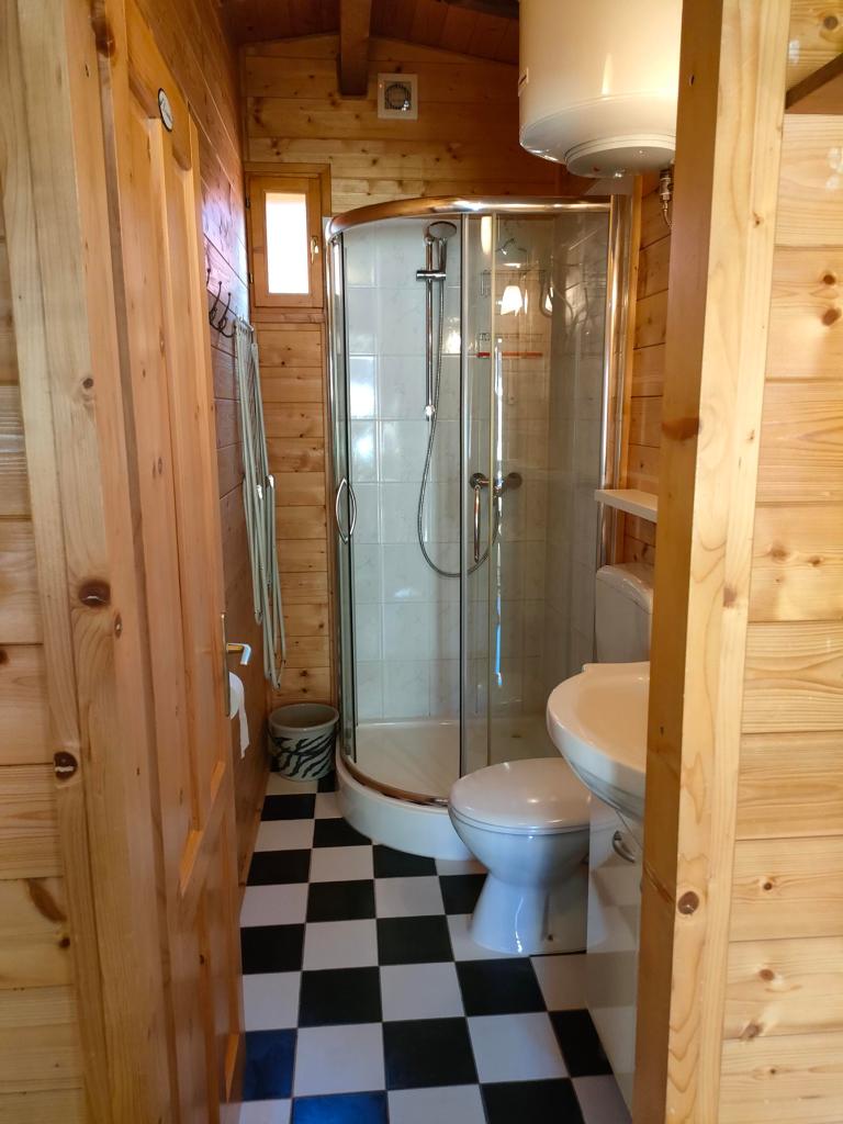 De badkamer is voorzien van een wastafel met onderkastje, een w.c. en een douchecabine. Er zijn verschillende legplanken/haakjes aanwezig en het warme water wordt aangevoerd door middel van een boiler.